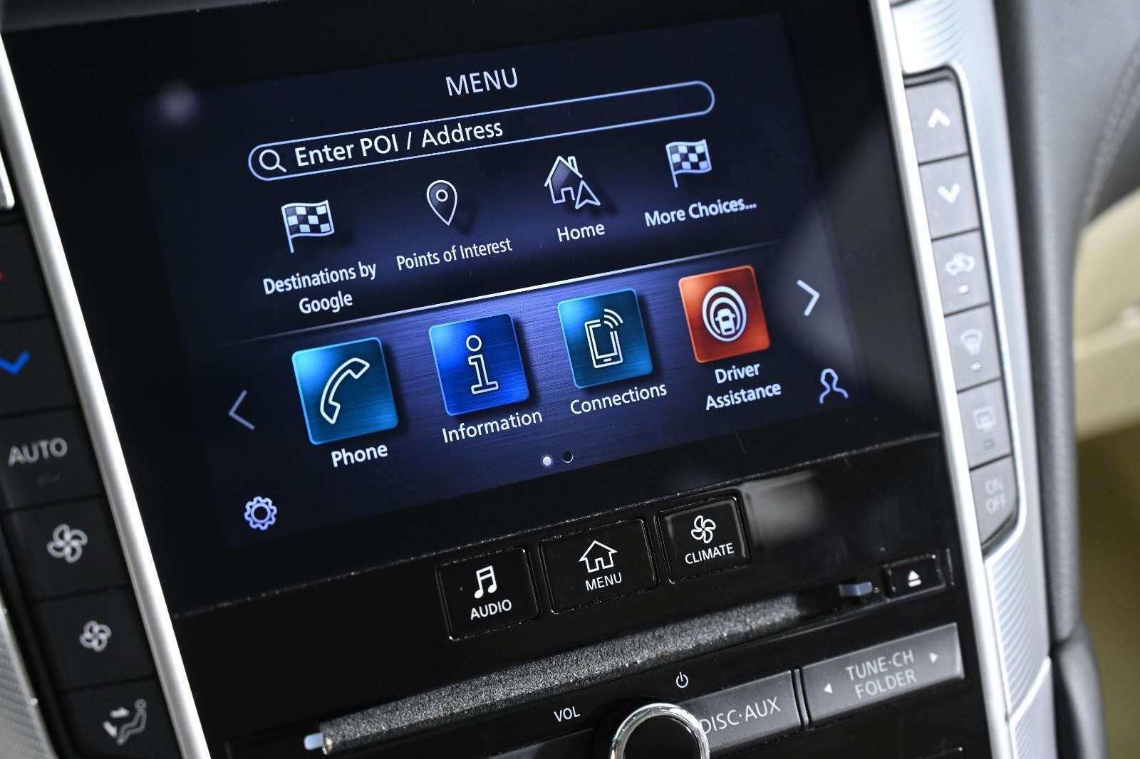 - Radio: INFINITI InTouch w/AM/FM/HD/CD -inc: dual HD display system w/upper 8" and lower 7" WXGA touchscreen displays, Apple CarPlay and Android Auto, streaming audio via Bluetooth®, Bluetooth® hands-free phone system w/text messaging assistant, voice recognition for audio, Bluetooth® and vehicle information including music search by voice, SiriusXM radio w/3-month complimentary trial, 6-speaker audio system, 2 illuminated USB connection ports (1 type A and 1 type C) for iPod interface and other compatible devices, 2 12-volt accessory power outlets and auxiliary audio input