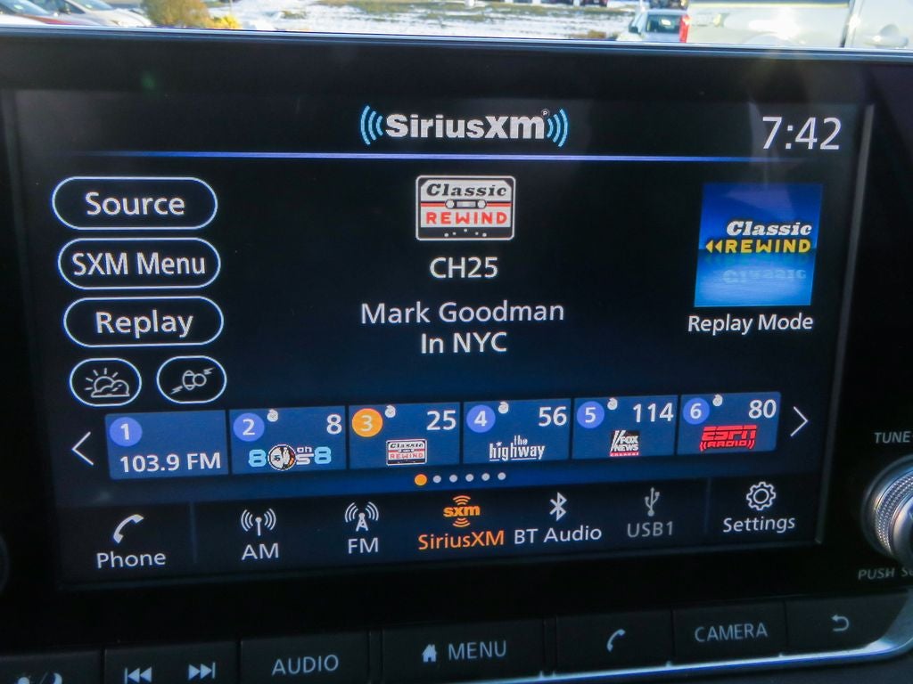 - Radio: AM/FM w/RDS/MP3/Aux-In -inc: 6 speakers plus 2 tweeters in A-pillar, 8" color display w/multi-touch control, streaming audio via Bluetooth®, Bluetooth® hands-free phone system, hands-free text messaging assistant, Siri eyes free, Google Assistant voice recognition w/Apple CarPlay and Android Auto, NissanConnect, (1) front USB connection port (type A), (1) additional front USB (type C) and (1) charge-only USB (type A) center console and SiriusXM radio w/advanced audio features