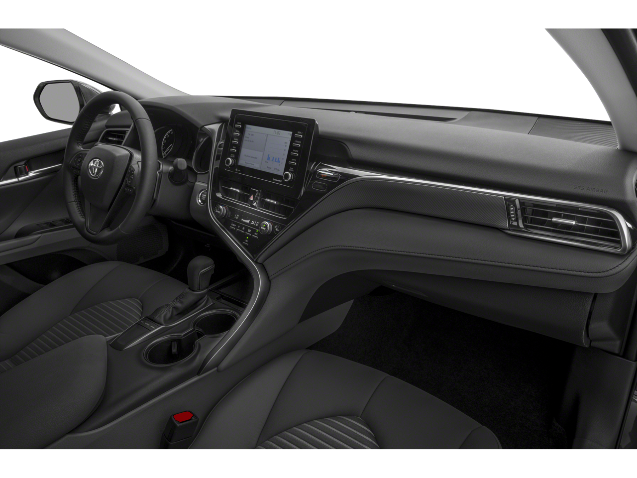The Camry SE's well-appointed interior showcases premium touches, including a Leather steering wheel, Tilt and Telescoping steering column, and Sport SofTex Seat Trim with Fabric Inserts. Stay connected with the intuitive infotainment system, featuring Apple CarPlay and Android Auto compatibility.