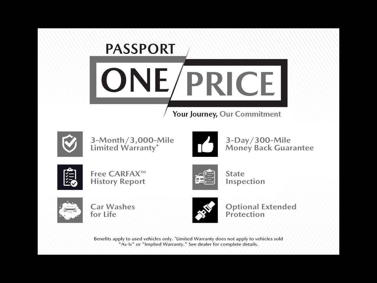 Introducing our PASSPORT ONE PRICE program where qualified pre-owned vehicles receive a 3-Month/3000-Mile Limited Warranty, a 3-Day/300-mile money back guarantee, State Inspection, and car washes for life! See dealer for additional details. *Limited Warranty does not apply to vehicles sold As-Is or Implied Warranty.